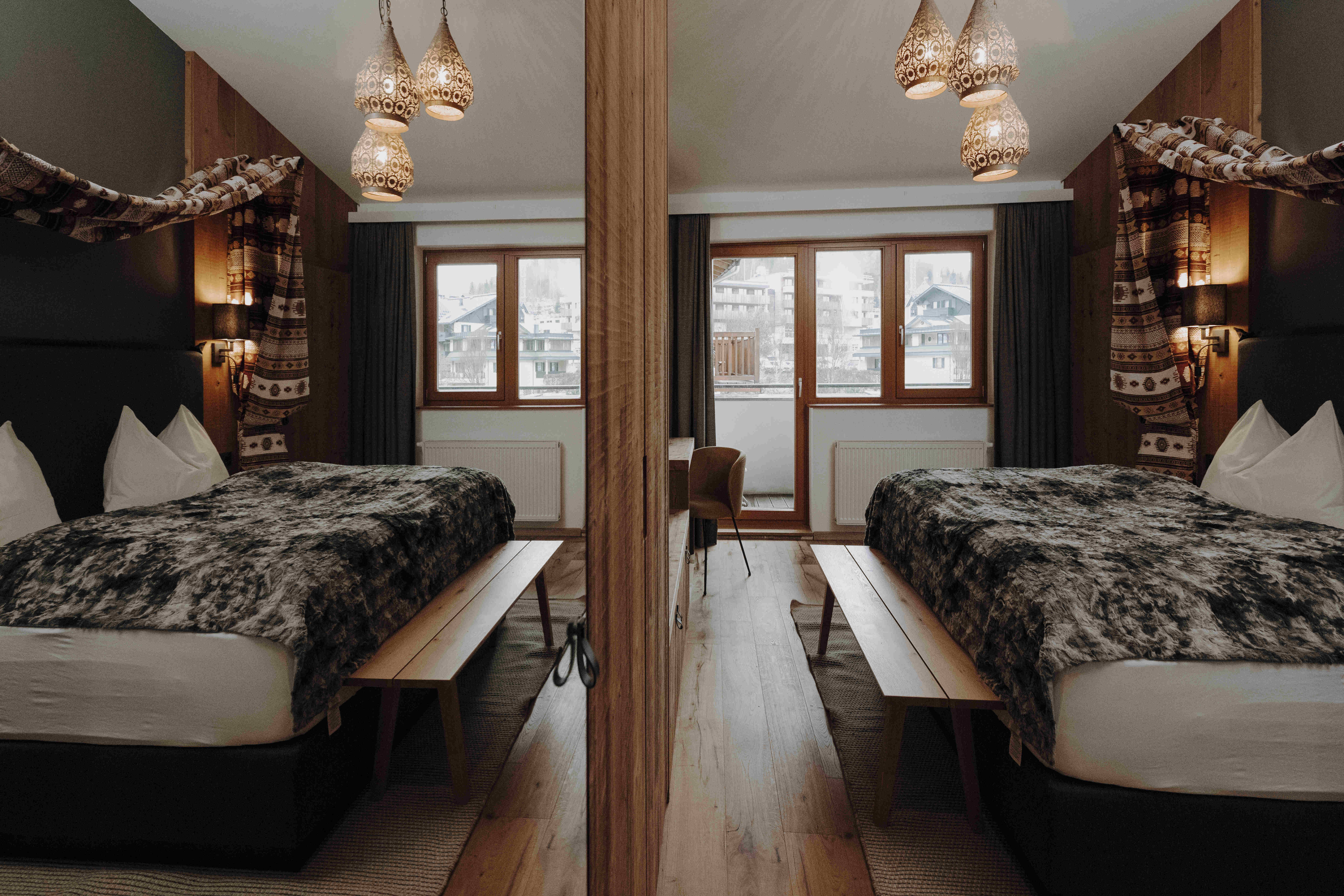 20 – 25 m², max. 2 people, double room in the main house with alpine interior design, balcony, bunk bed for one child. Available as a double room for single use or as a single with kids.